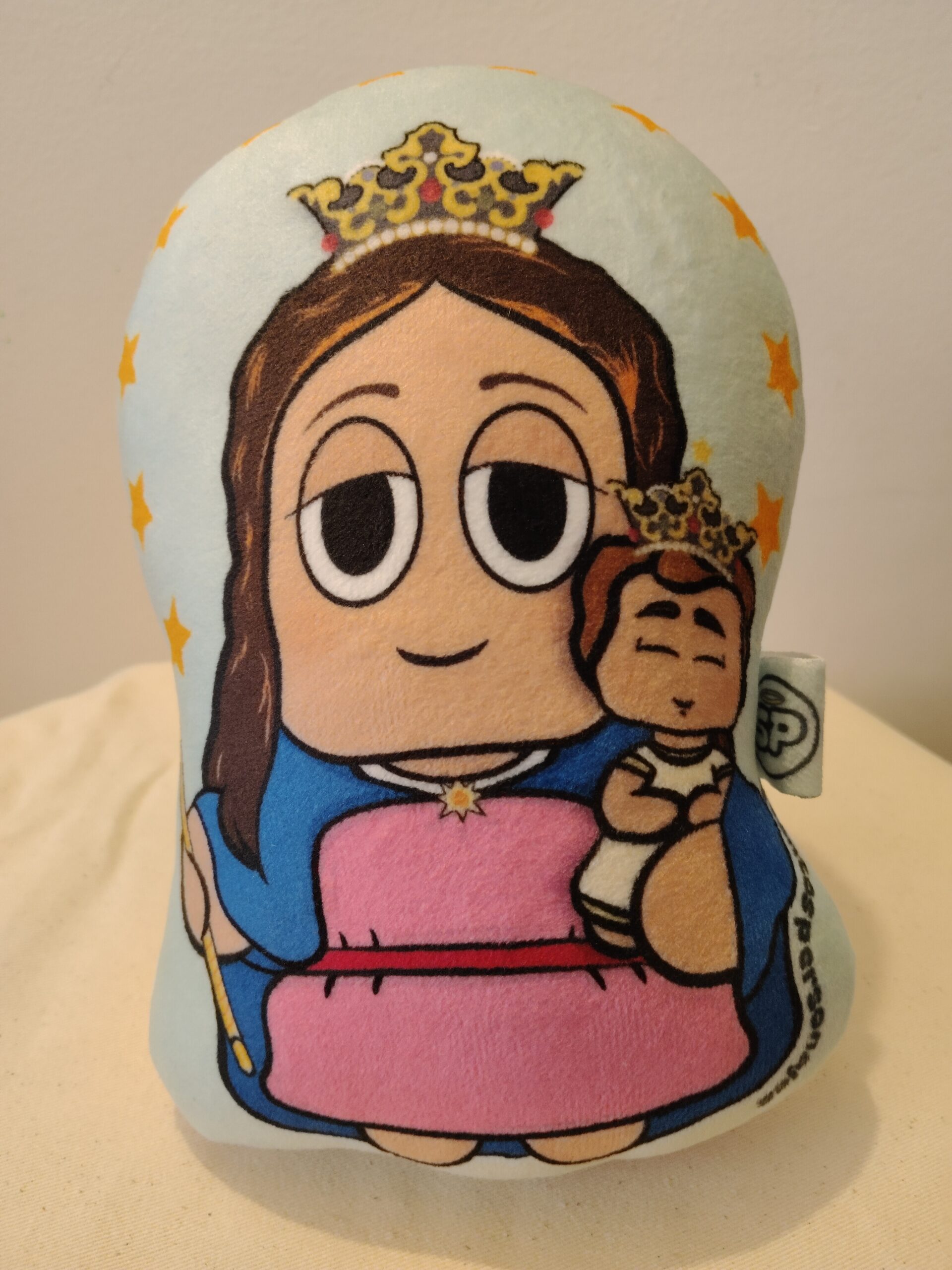 Peluche de 20 cm con ilustración de la Advocación de María Auxiliadora con relleno siliconado antialérgico, hecho en suavetina.